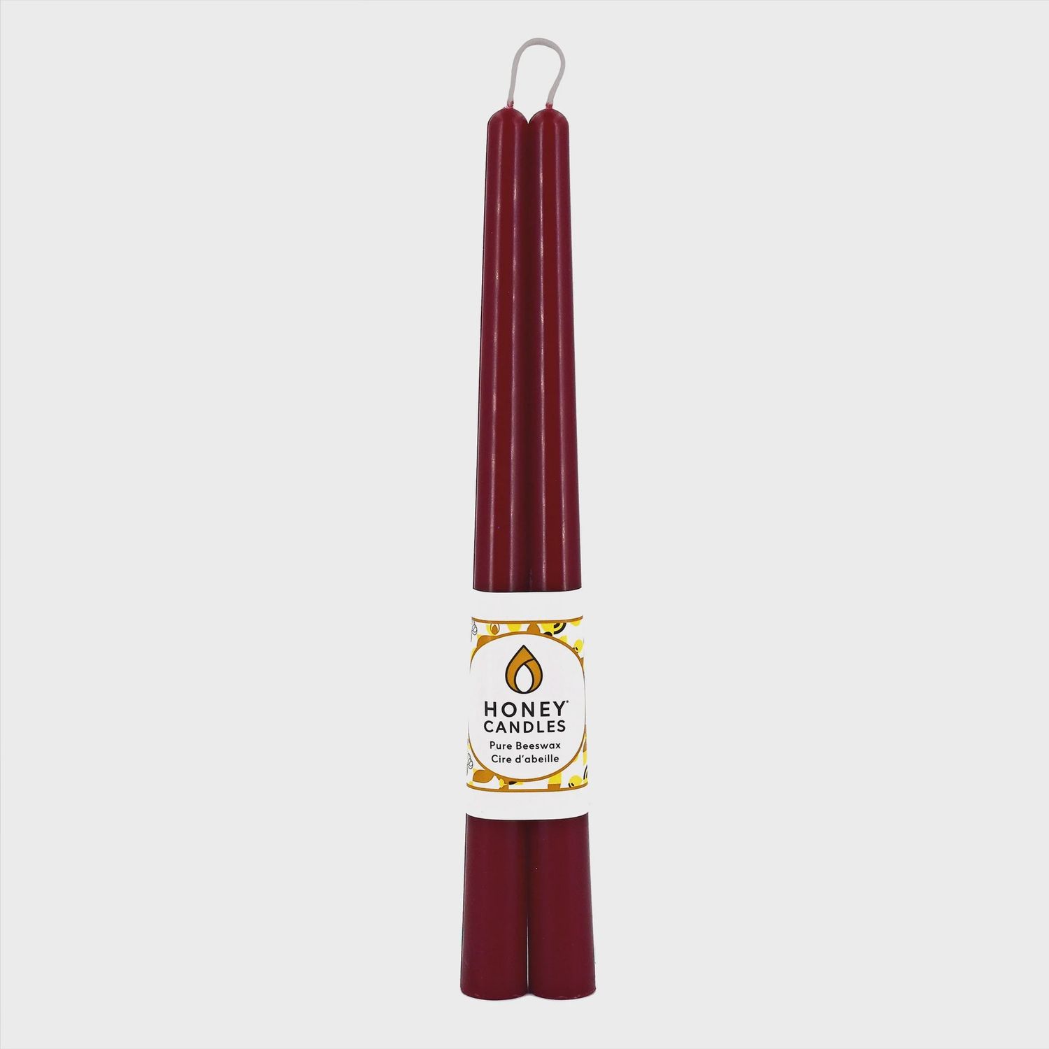 A loop of two 12 inch Burgundy candlesticks. Simple and pure, Honey Candles® 100% natural beeswax taper candle is perfect for the dinner table, your buffet table or any occasion. Long-lasting, with a warm amber glow and a soft honey aroma, it makes for a fantastic gift, too!
